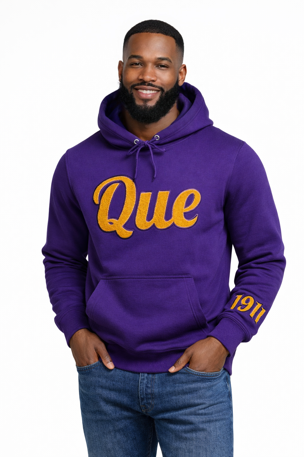 This pullover hoodie represents Omega Psi Phi Fraternity, Inc., founded in 1911. Designed in rich purple with old gold chenille-style detailing, it features bold “Que” lettering across the chest with 1911 embroidered down the sleeve for an elevated, statement look that honors Omega pride and legacy.