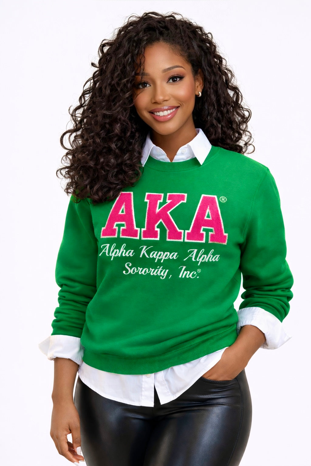 This sweatshirt honors Alpha Kappa Alpha Sorority, Incorporated, founded in 1908. The bold AKA chenille embroidery is displayed across the chest in pink and white, with Alpha Kappa Alpha Sorority Inc. embroidered underneath.