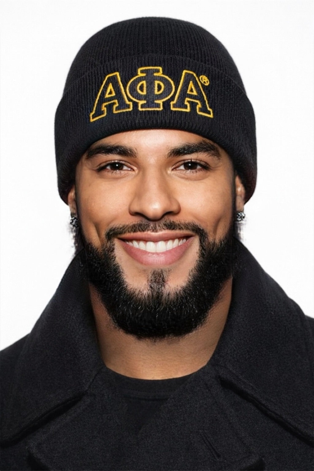 Classic black knit beanie featuring embroidered ΑΦΑ lettering for members of Alpha Phi Alpha. Designed for everyday wear with a comfortable, secure fit.