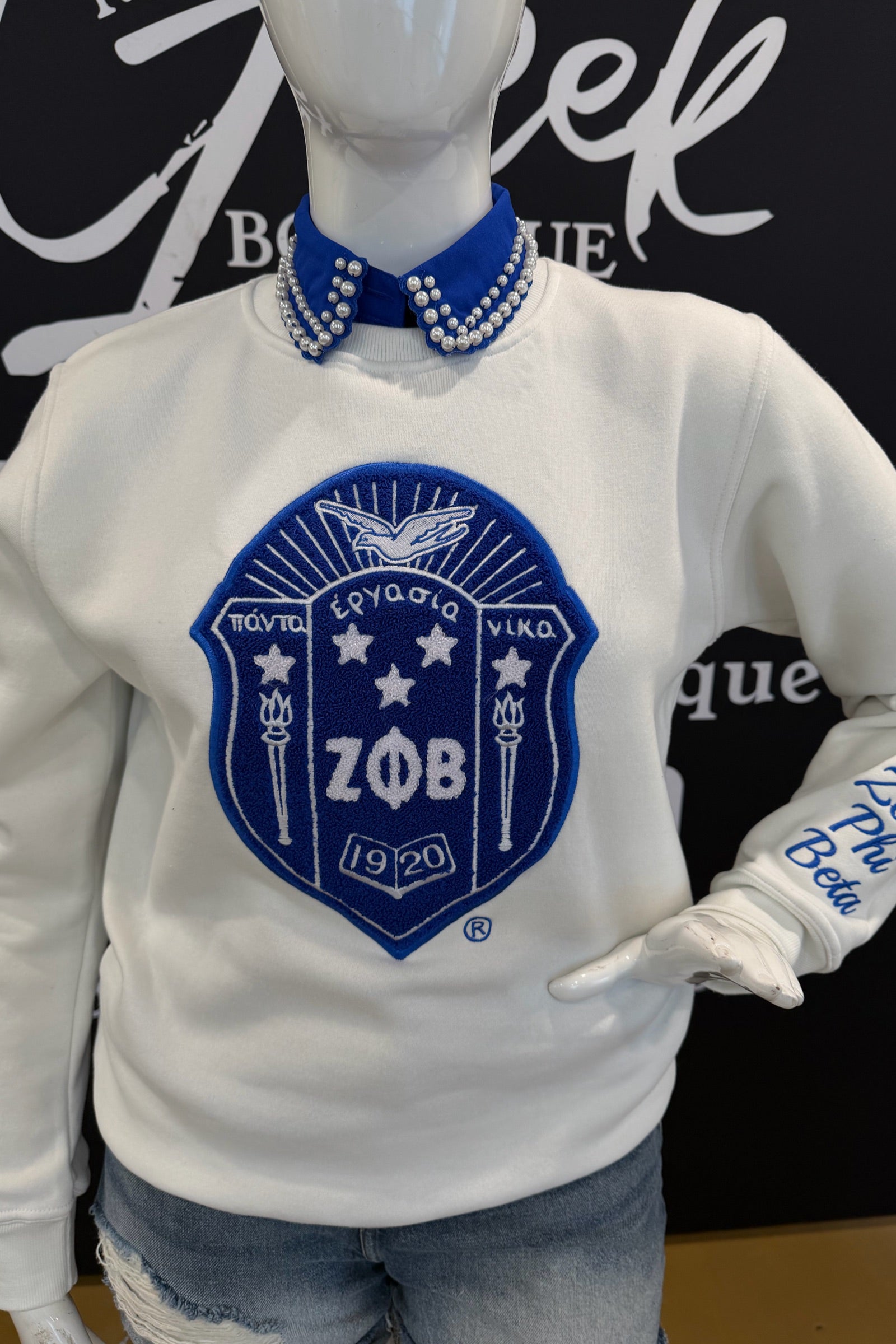 Show your Zeta pride in this bold and timeless royal blue sweatshirt. Featuring a premium chenille crest and “Zeta Phi Beta” embroidered on the sleeve, it’s the perfect blend of comfort and style for any occasion.